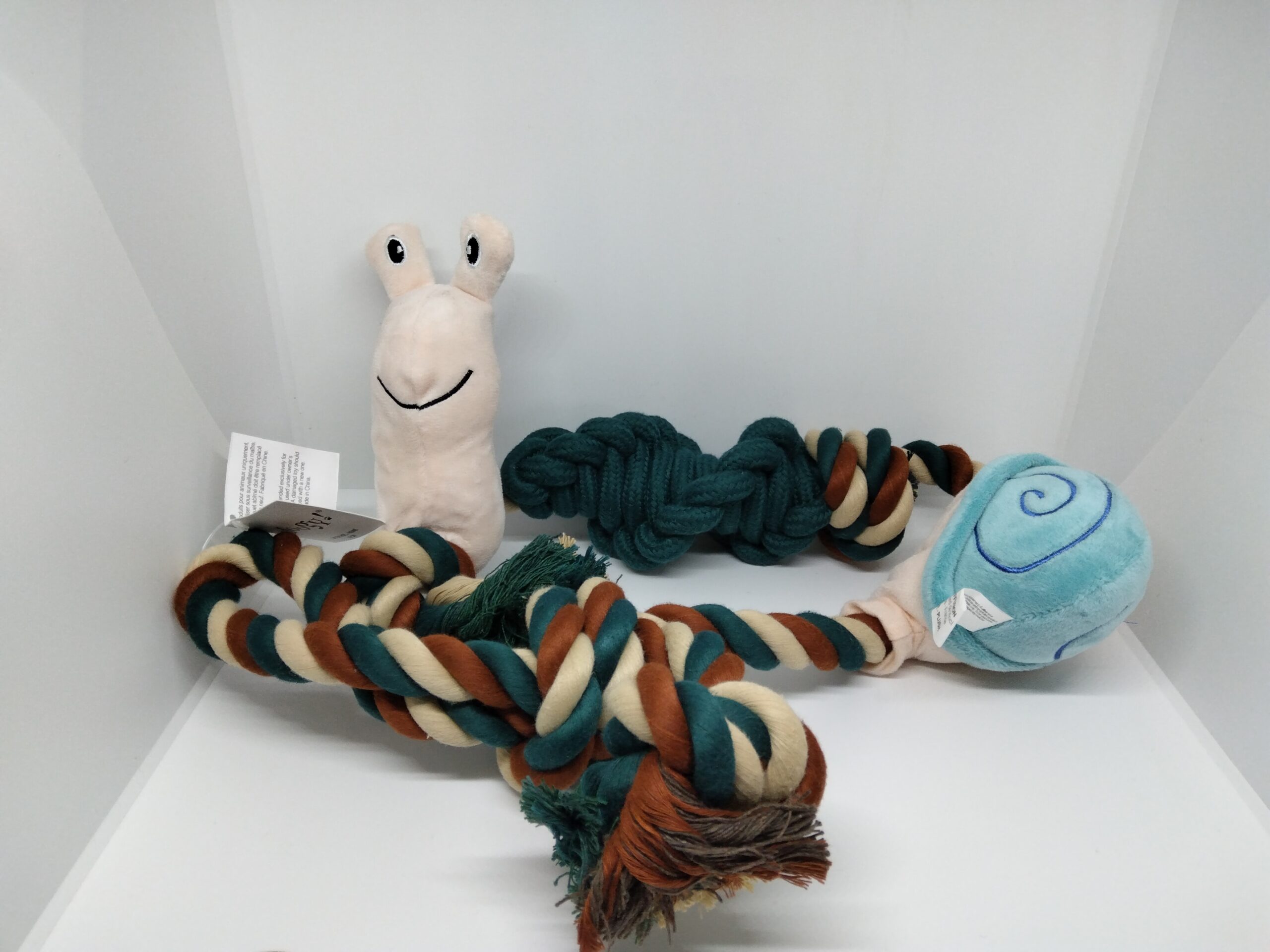 Idéal pour les grands chiens, sa conception robuste avec des noeuds renforçés assure une durabilité maximale tandis que la peluche escargot ajoute une dimension ludique.