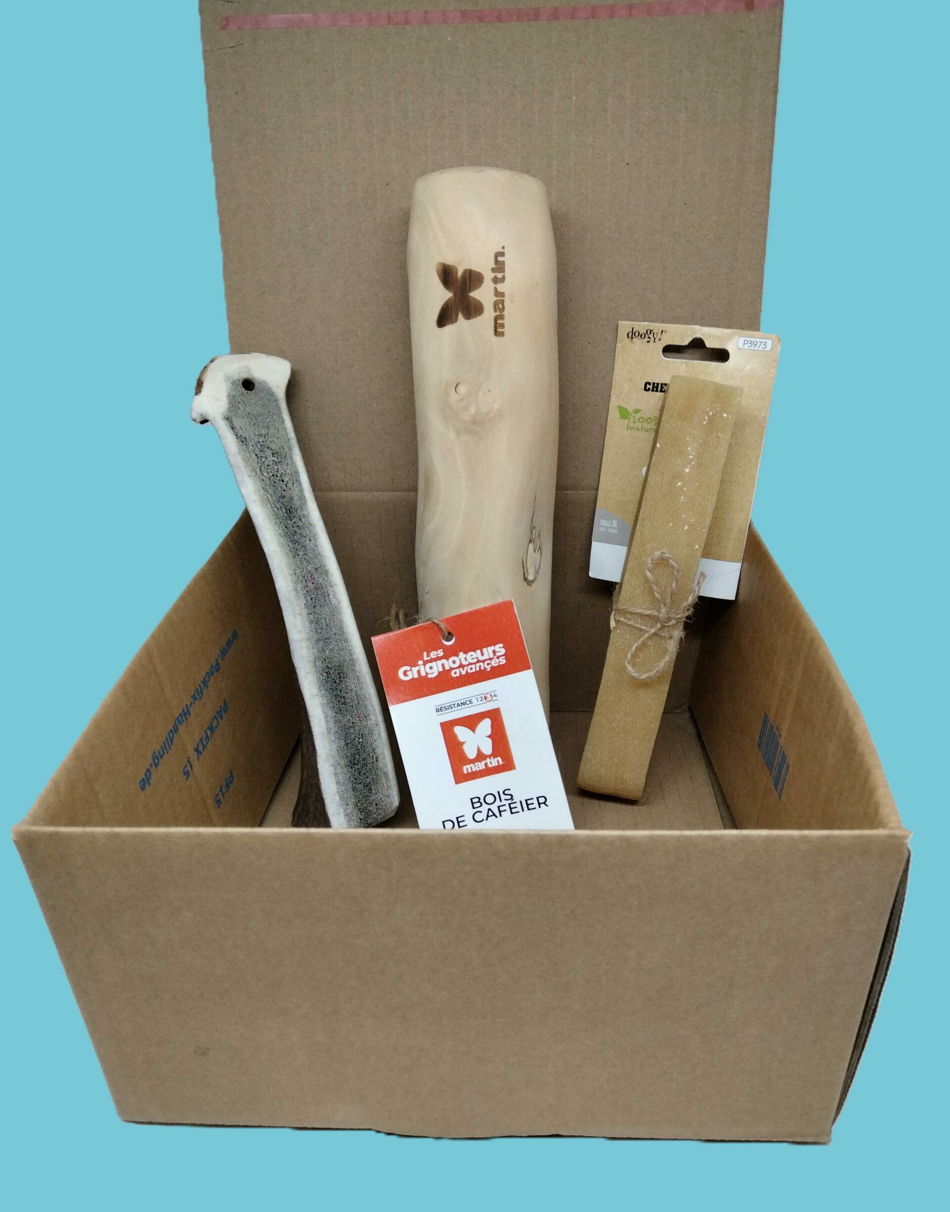 La box mastication idéale pour occuper votre chien durant des heures! Veillez à alterner les produits d’un jour à l’autre et ne pas laisser plus d’une demi heure et toujours sous surveillance, elle se compose :